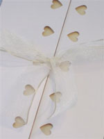A tall two-fold card delicately tied in a bow at the front with a gorgeous chiffon ribbon which has been looped through the hearts.